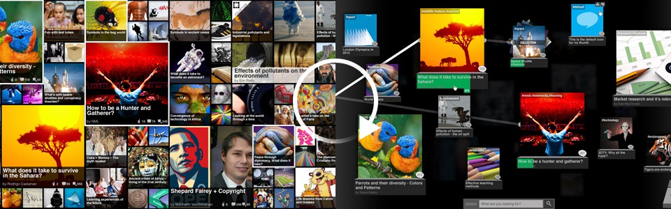 Left: The first version brought to life the idea of a wall of content, but became too cluttered and difficult to navigate. Right: The next version alleviated this problem adding more engaging features to make the service more than just a visual wikipedia.